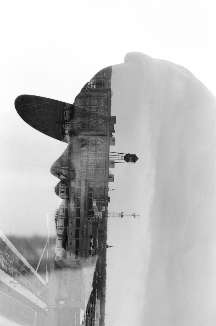 This was captured on Acros 100 and both shots were metered for the midtones and the highlights still didn’t blow out which shows the amazing exposure latitude of B&W film. If both shots were metered for the shadows the highlights would have completely blown out which would have made this double exposure much stronger.